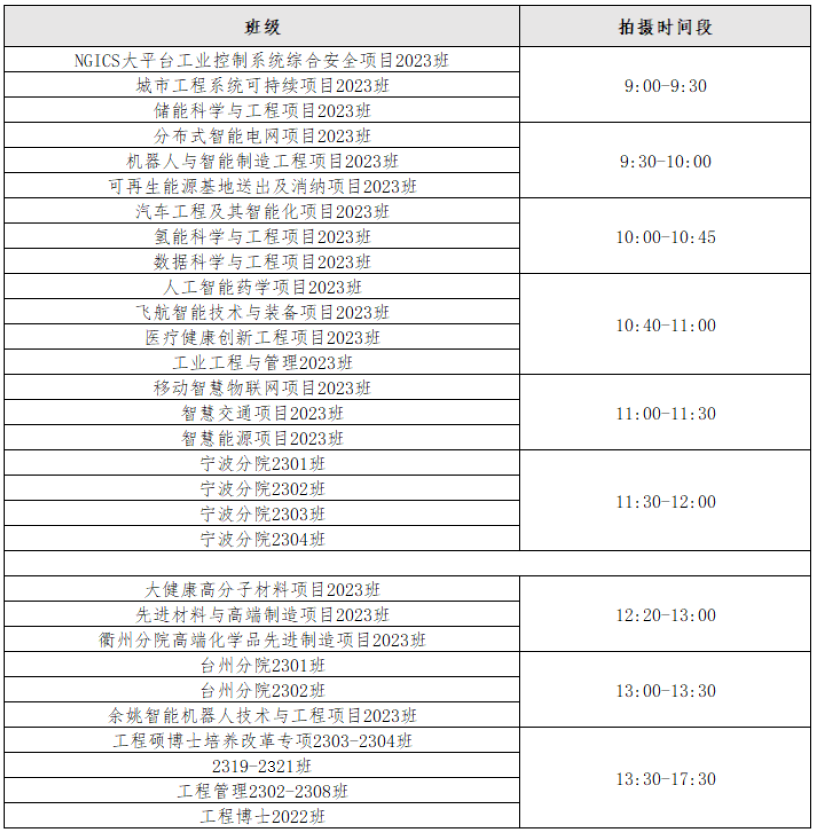 工程师学院2026届毕业研究生个人照拍摄定于2025年11月15日(周六)9:00-17:30进行,地点为工程师学院行政楼103教室。为避免聚集、提高现场图像信息采集工作的效率,预排各班拍照时间表如下: