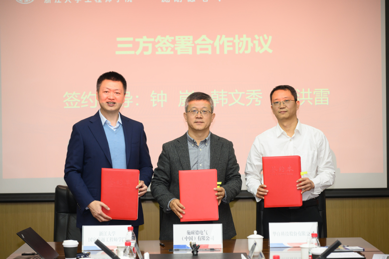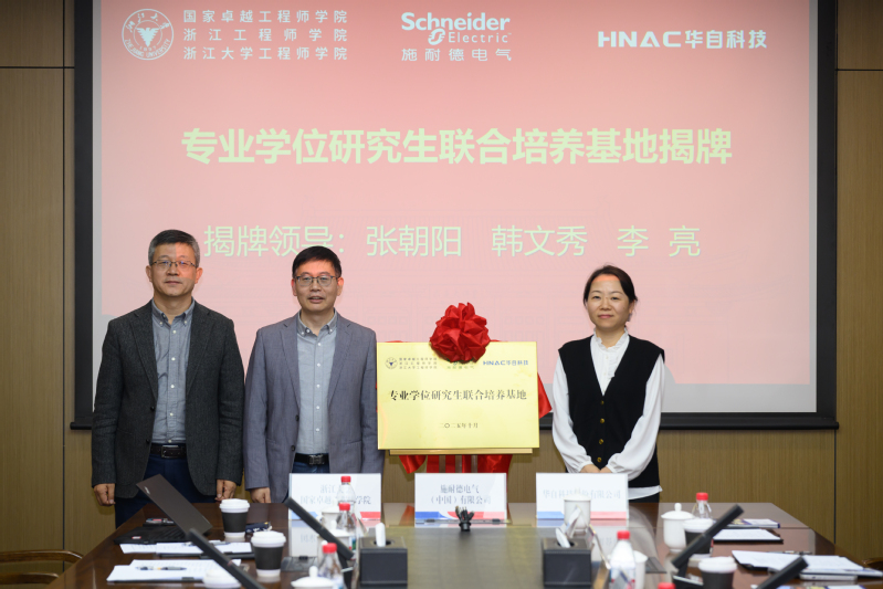 仪式上,张光新、张连权、苗洪雷共同为“绿色智能制造”工程师技术中心揭牌,张朝阳、韩文秀、李亮为“专业学位研究生联合培养基地”揭牌。并现场签约了《施耐德电气-浙江大学国家卓越工程师学院校企合作框架协议》《三方合作协议》及《捐赠协议书》。