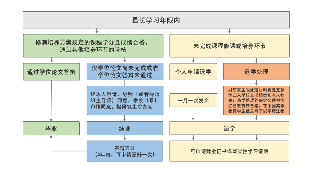 2.根据《浙江大学研究生学籍管理实施办法》(浙大发研〔2024〕34号)第七章第三十二条的规定,研究生学业成绩未达到学校研究生教学管理相关要求或者在学校规定的修业年限内未完成学业的,应予退学。